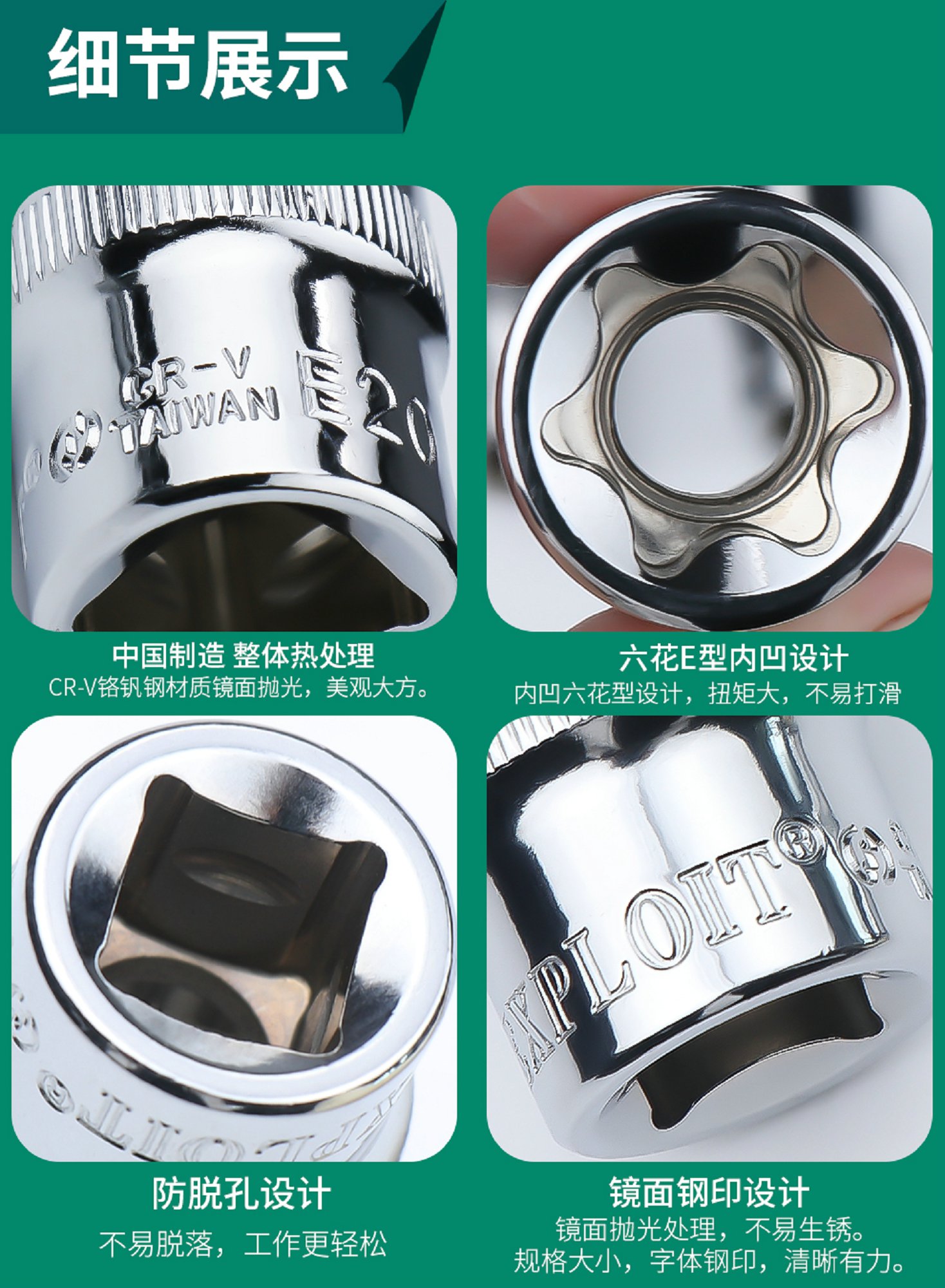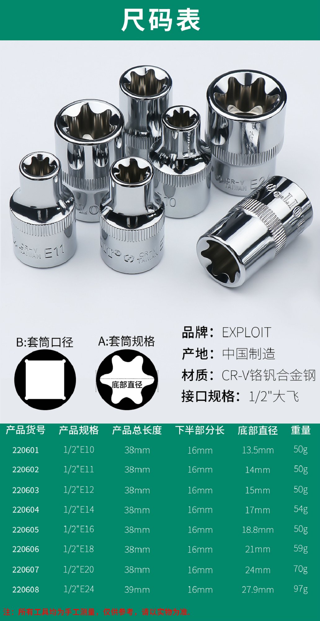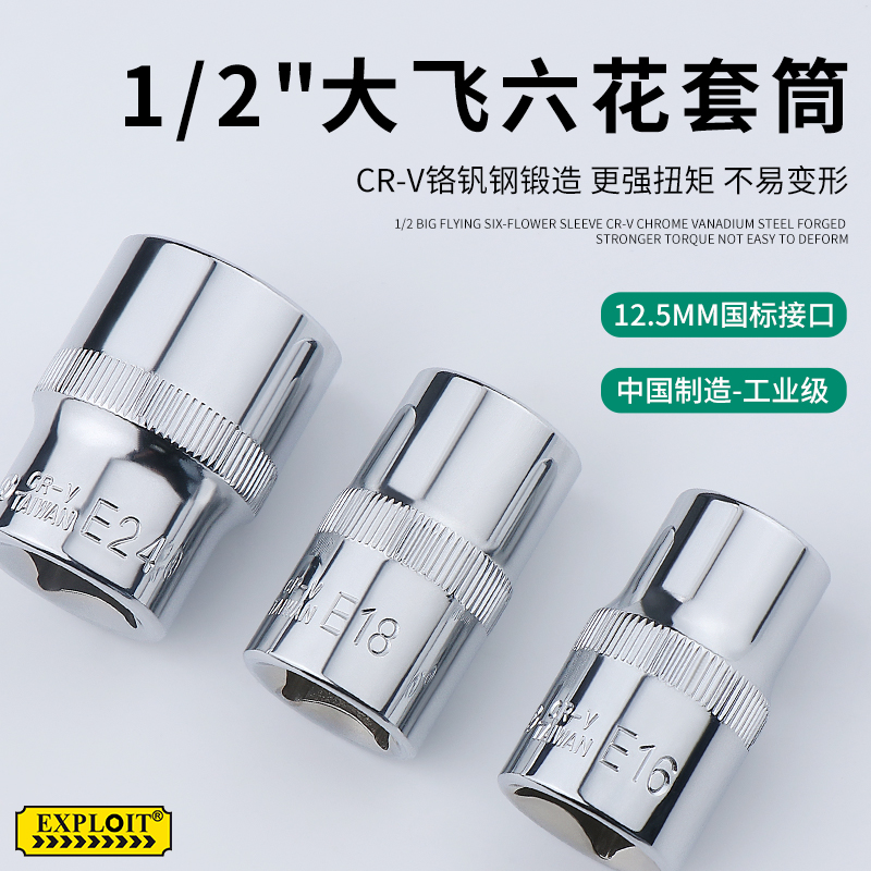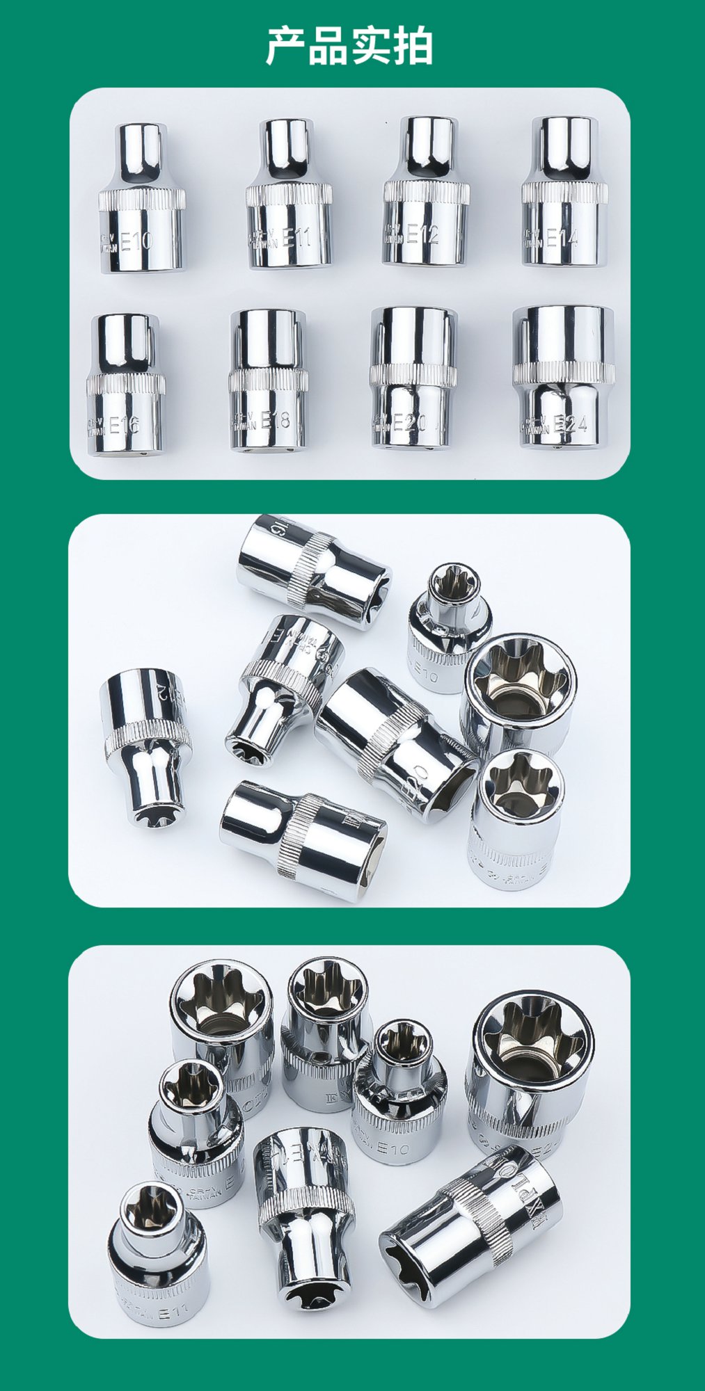 开拓1/2大飞e型6角套筒头花键梅花星型e12E10e14六角扭力扳手批头