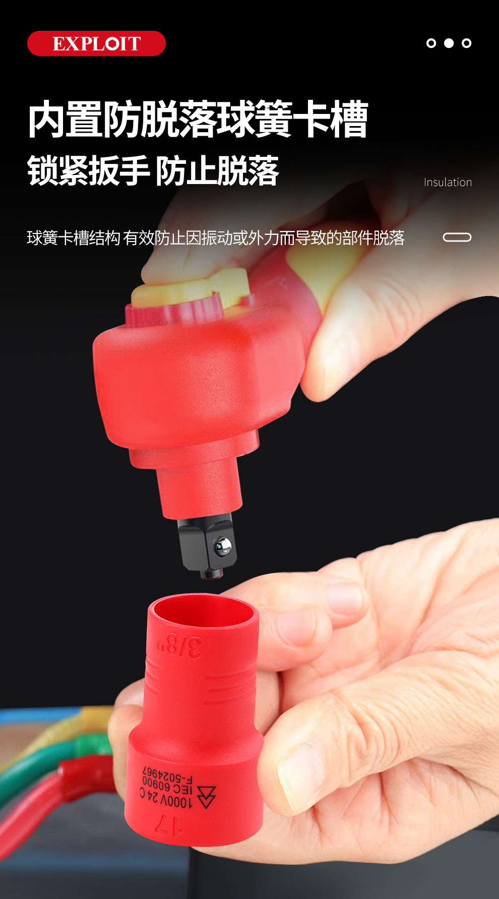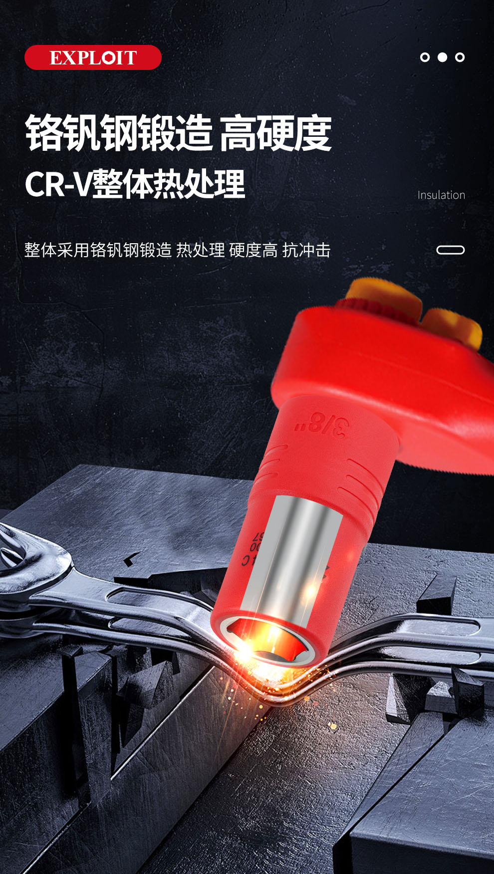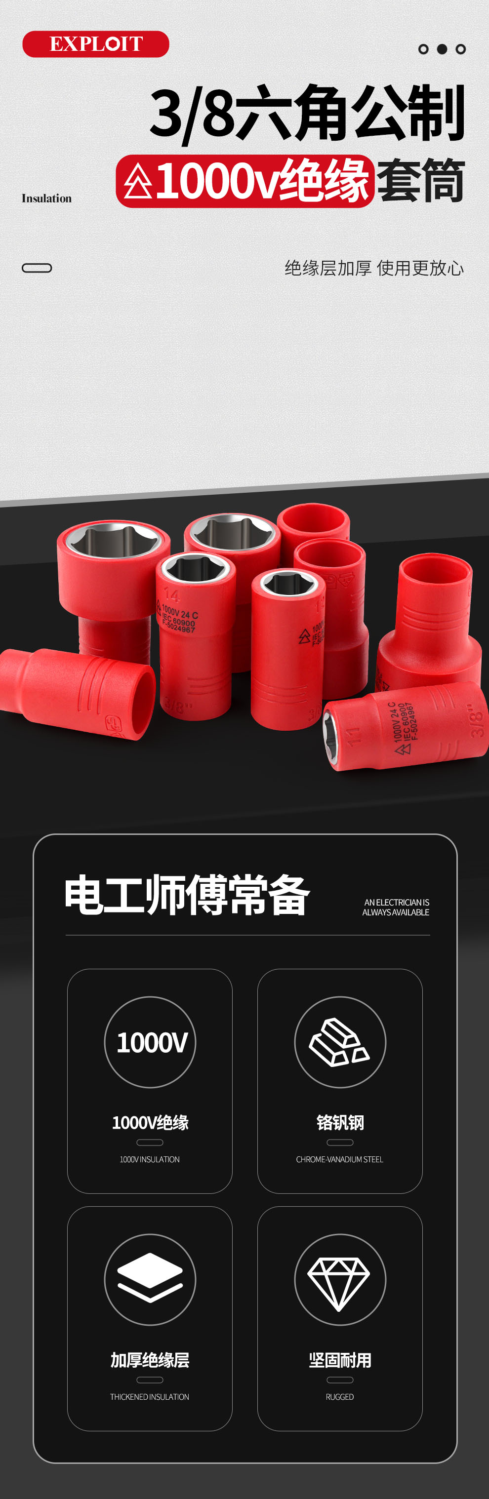 开拓绝缘六角套筒VDE认证1000V伏耐高压电工专用3/8中飞公制套筒