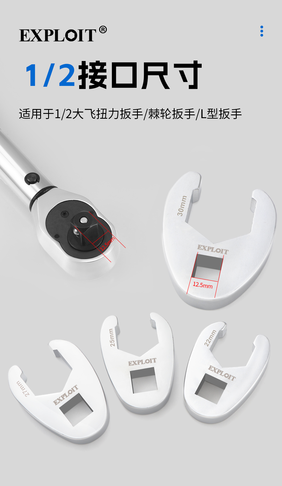 开拓1/2大飞扭力扳手开口油管头棘轮扳手配件力矩插口转接插件