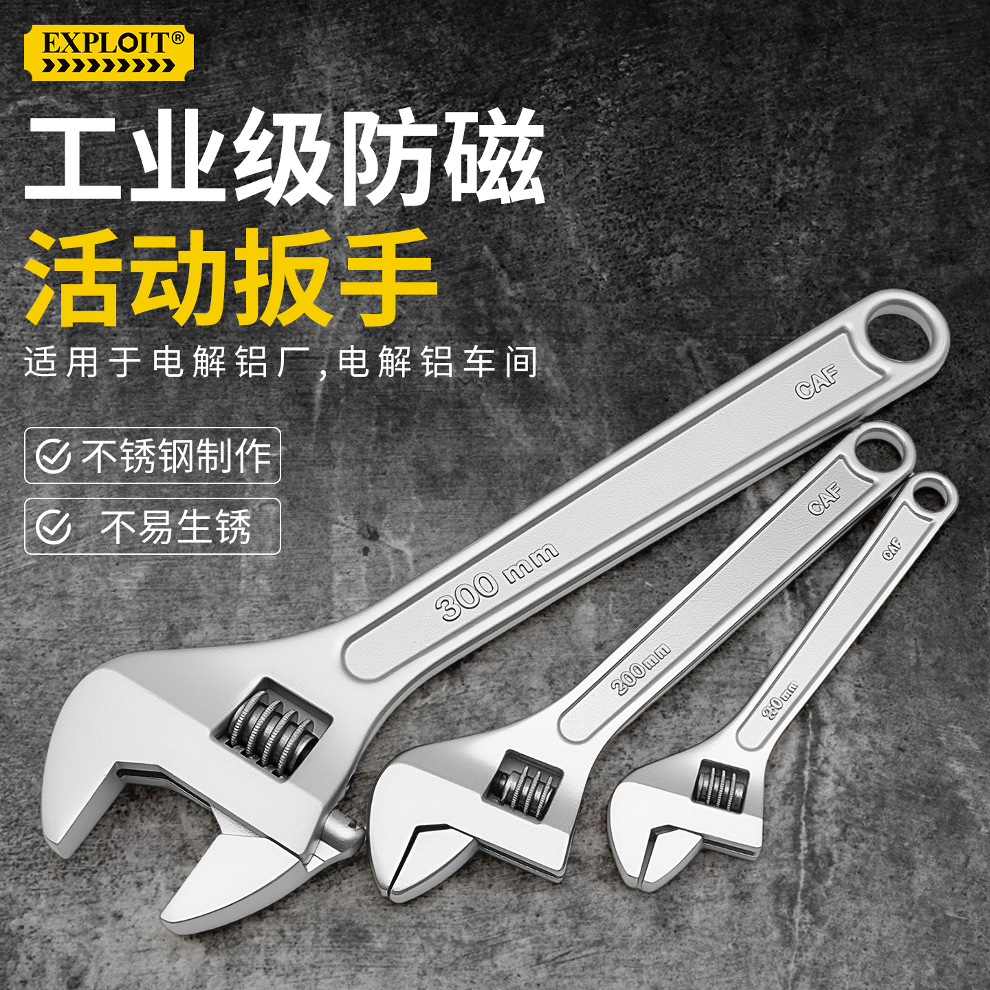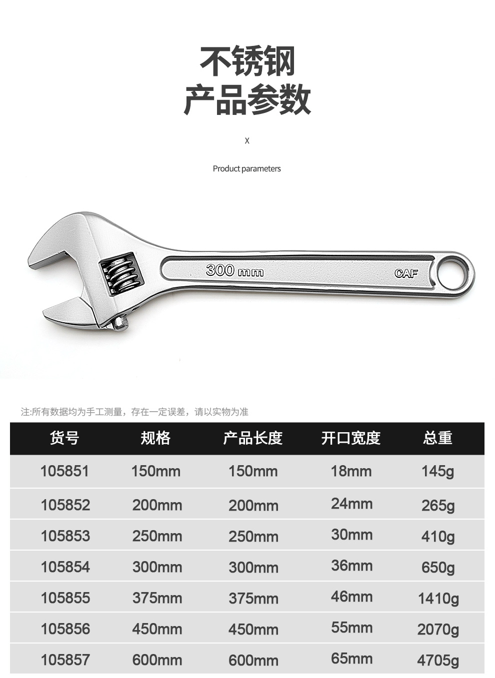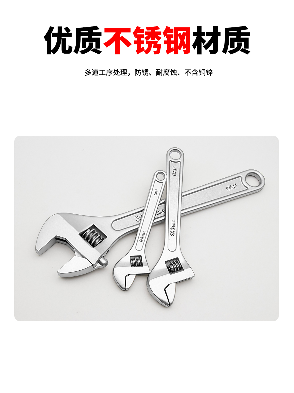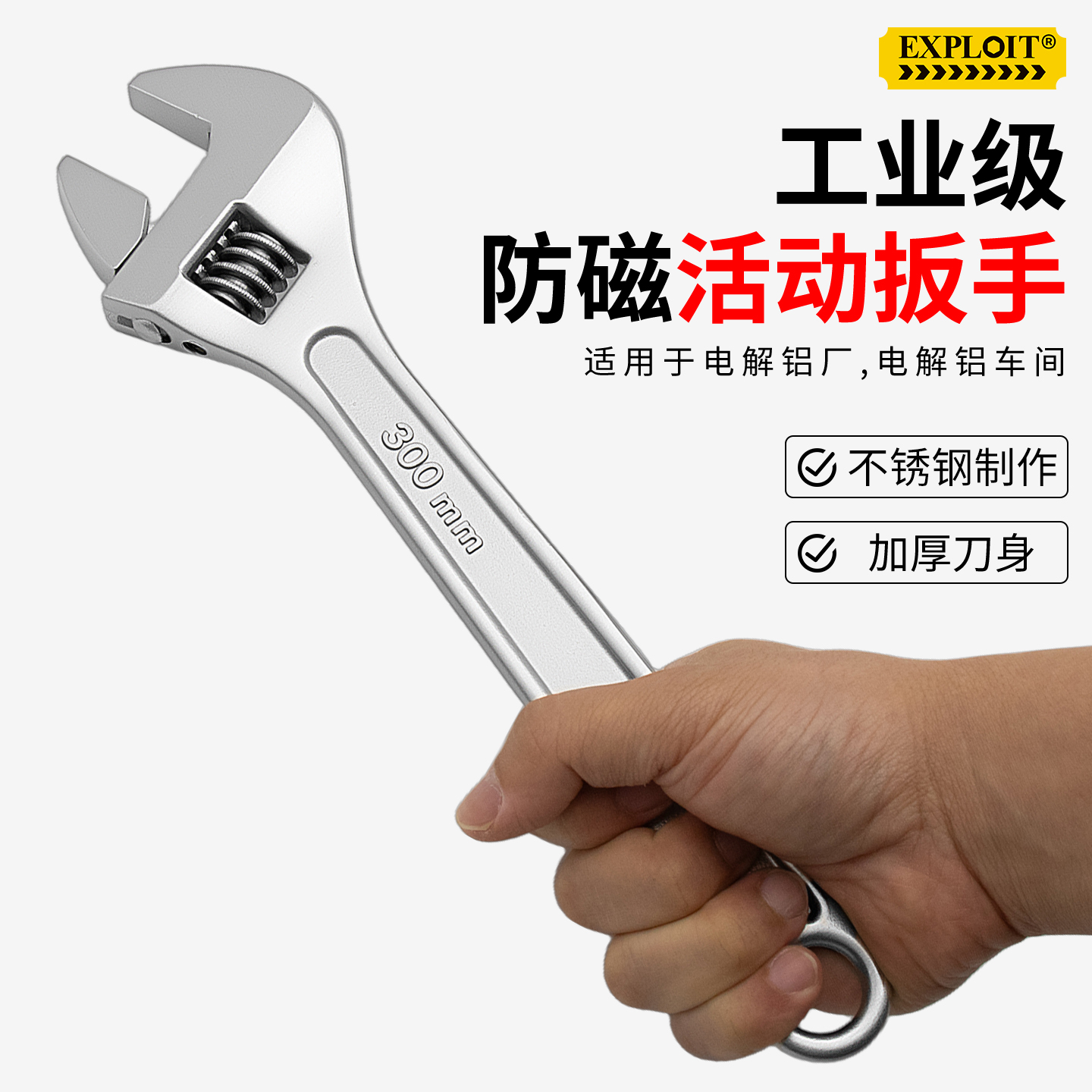 开拓防磁304不锈钢可调活动扳手6-24寸防锈防腐蚀白钢活口扳手