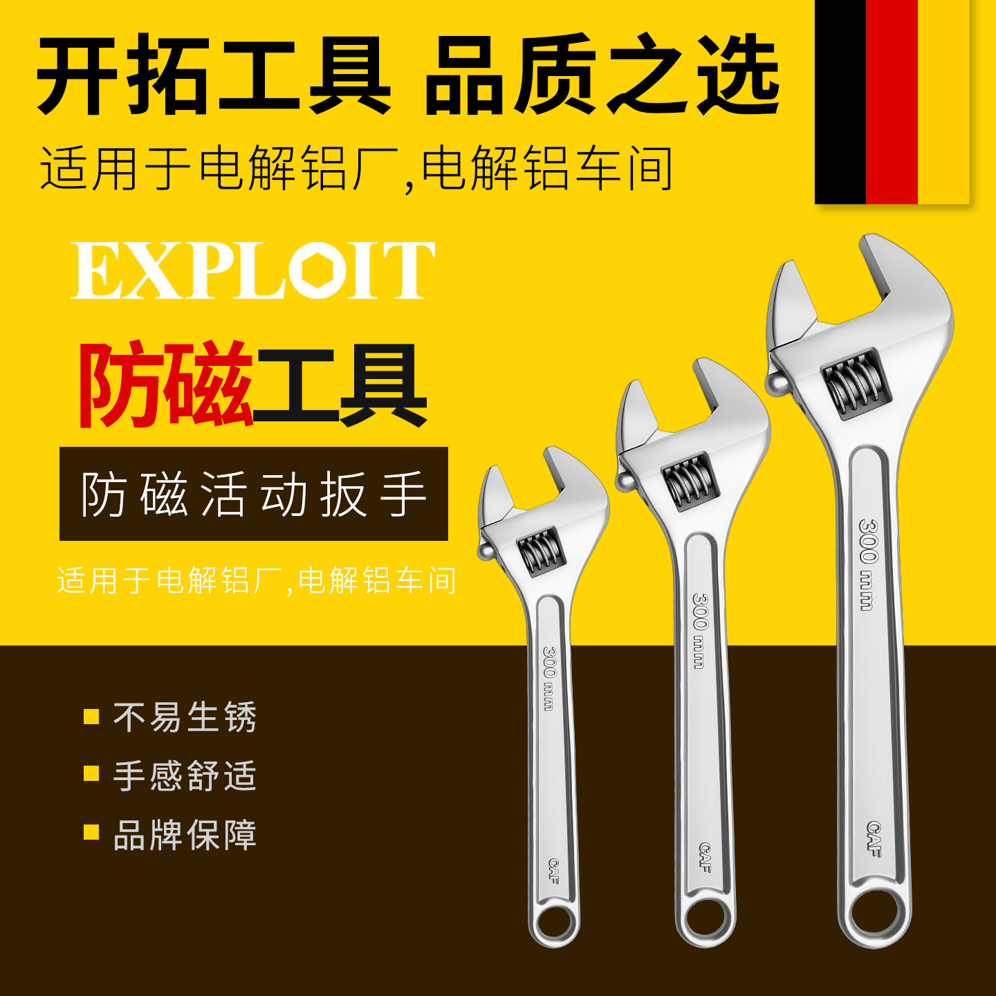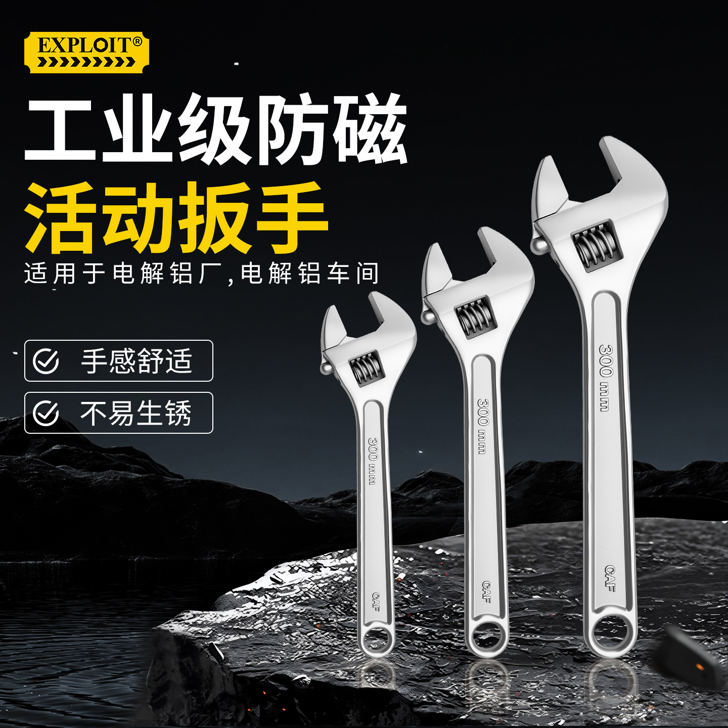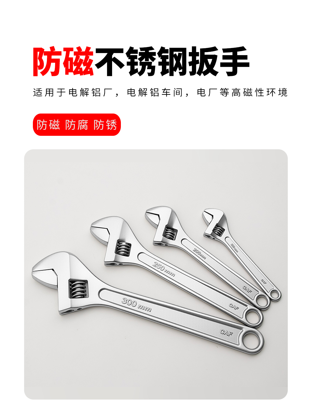 开拓防磁304不锈钢可调活动扳手6-24寸防锈防腐蚀白钢活口扳手