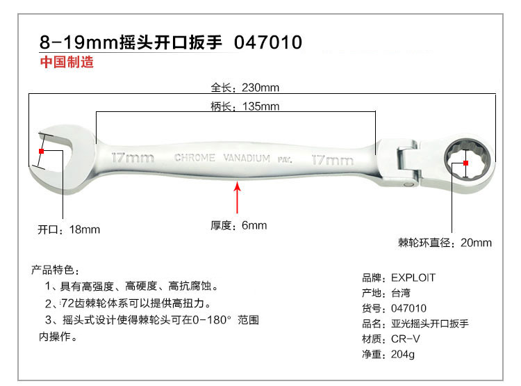 开拓 台湾制造8-19mm摇头扳手 棘轮扳手 两用梅花开口扳手 047010