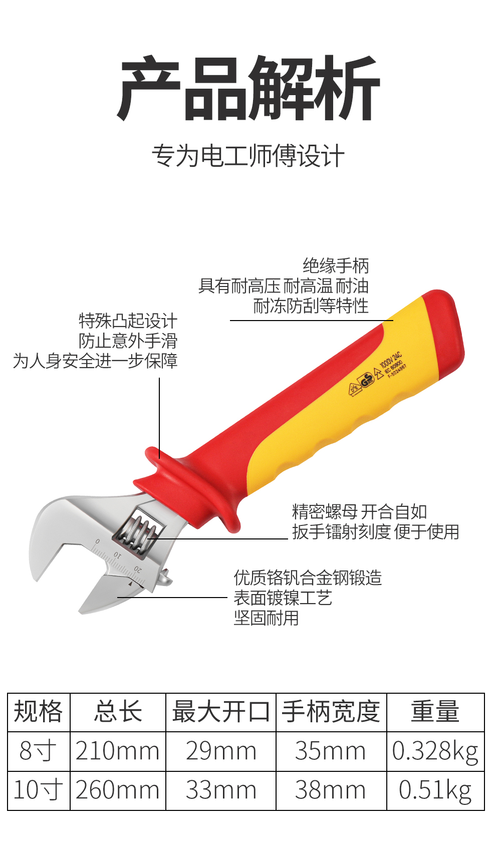 开拓 绝缘活络扳手1000V耐高压VDE认证电工专用8/10寸板子工具